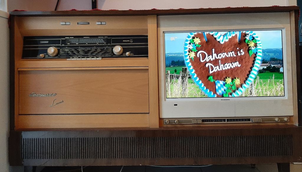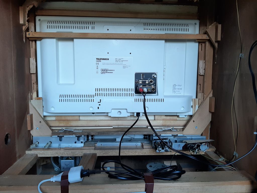 | Neues von der Luxus-Truhe: das Fernsehteil zu reparieren hat sich als unmöglich herausgestellt, das Ersatzteil war nicht aufzutreiben. Ich habe mich deshalb zu einer Radikallösung entschlossen und einen modernen Fernseher eingebaut. | ||