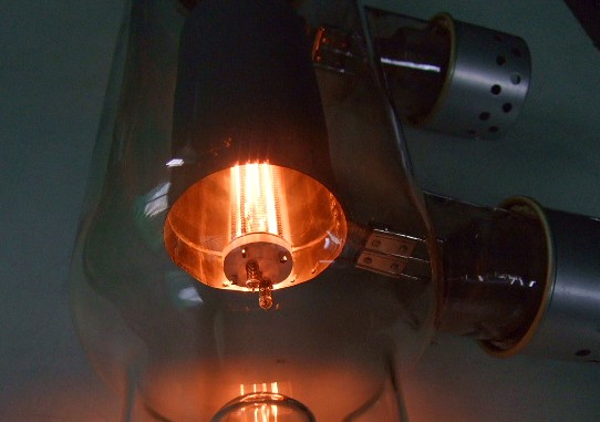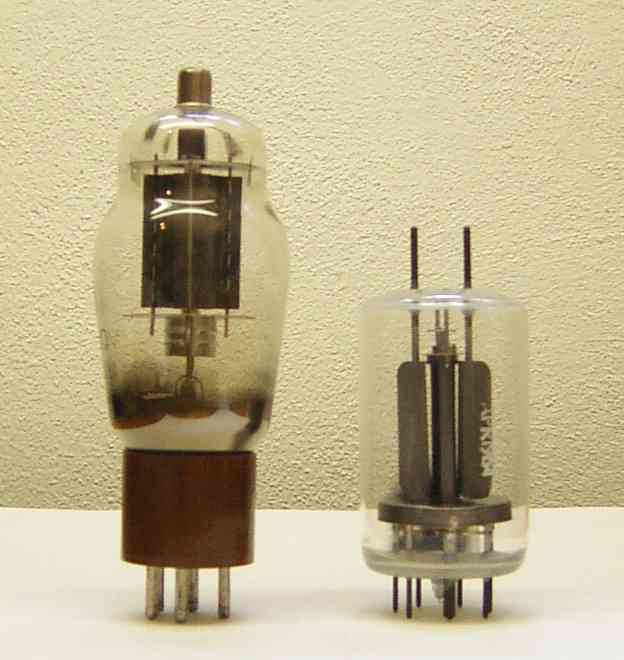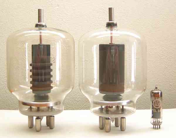 links eine Senderöhre 8121 von RCA, daneben Sendetetrode GL 6283 von GE,