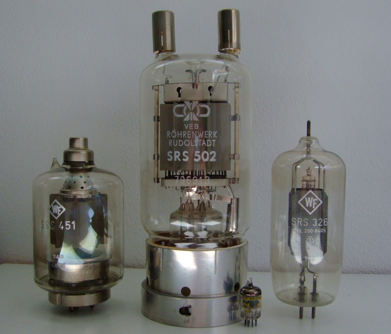 Drei weitere schöne Senderöhren aus DDR-Produktion: Links: SRS 451 von WF Mitte: SRS 502 von Röhrenwerk Rudolstadt Rechts: SRS 326 von WF Datenblätter findet man leicht im Internet. Die kleine Röhre ist eine PC 900, man übersieht sie fast... |