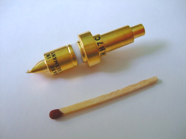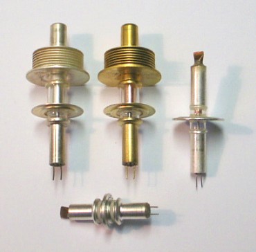 Bleistift-Röhren von links 6263A, UHF-Anwendungen bis 1700MHz, 7W 6264A, UHF-Anwendungen bis 1700Mhz, 7W 7554, UHF-Oszillatoren bis 3000MHz, 2W darunter 4043, UHF-Anwendungen bis 1000MHz Trioden, alle von RCA Eine Broschüre über Bleistiftröhren findet man unter Downloads |
