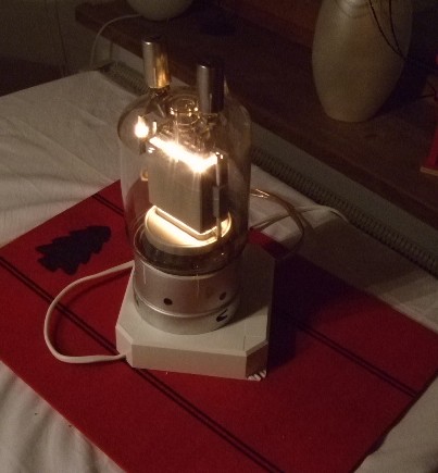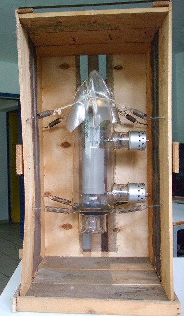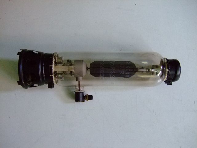 Senderöhre SRS 302 von WF. Direkt geheizte Triode für Industrie-Generatoren. Die Leistung liegt bei ca. 1200W. Baujahr 1982. Ein wirklich gewaltiges Teil, ca. 50cm lang, als Größenvergleich eine ECC 88. |