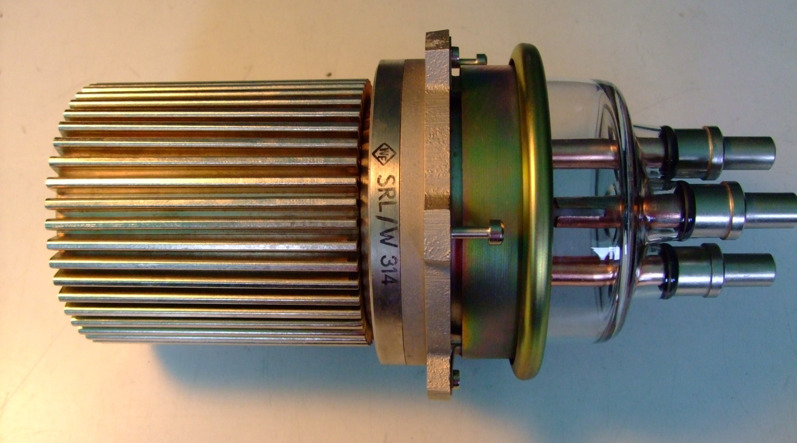 314 von WF. Für Rundfunksender und Industriegeneratoren, Leistung 25kW. Wird mit Luft- oder Wasserkühlung betrieben, bei Luftkühlung reduziert sich die Leistung auf die Hälfte. Eine schöne und seltene Röhre, meine ist auch nagelneu!