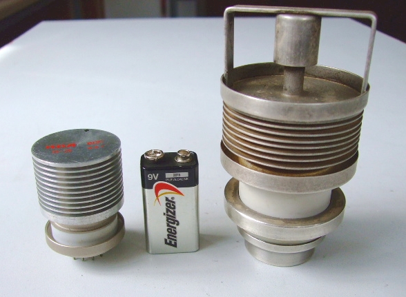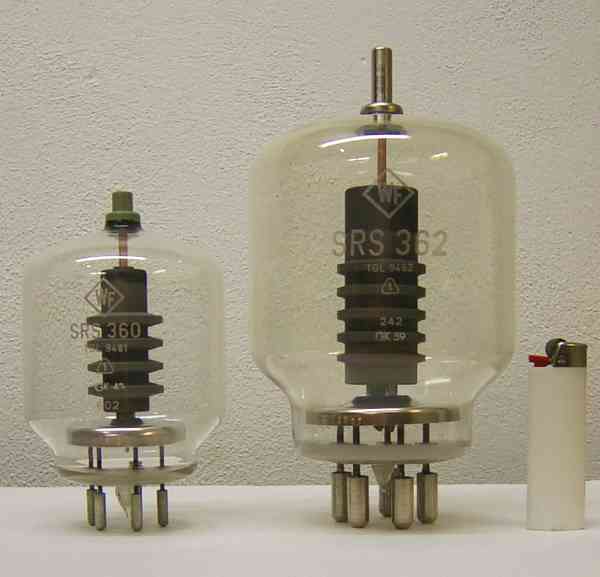 Senderöhren für Industriegeneratoren und Nachrichtensender links: TB4/1250, Triode rechts: QB5/1750, Tetrode beide ca. 1,5kW Größenvergleich EL84, H=75mm Hersteller Valvo |