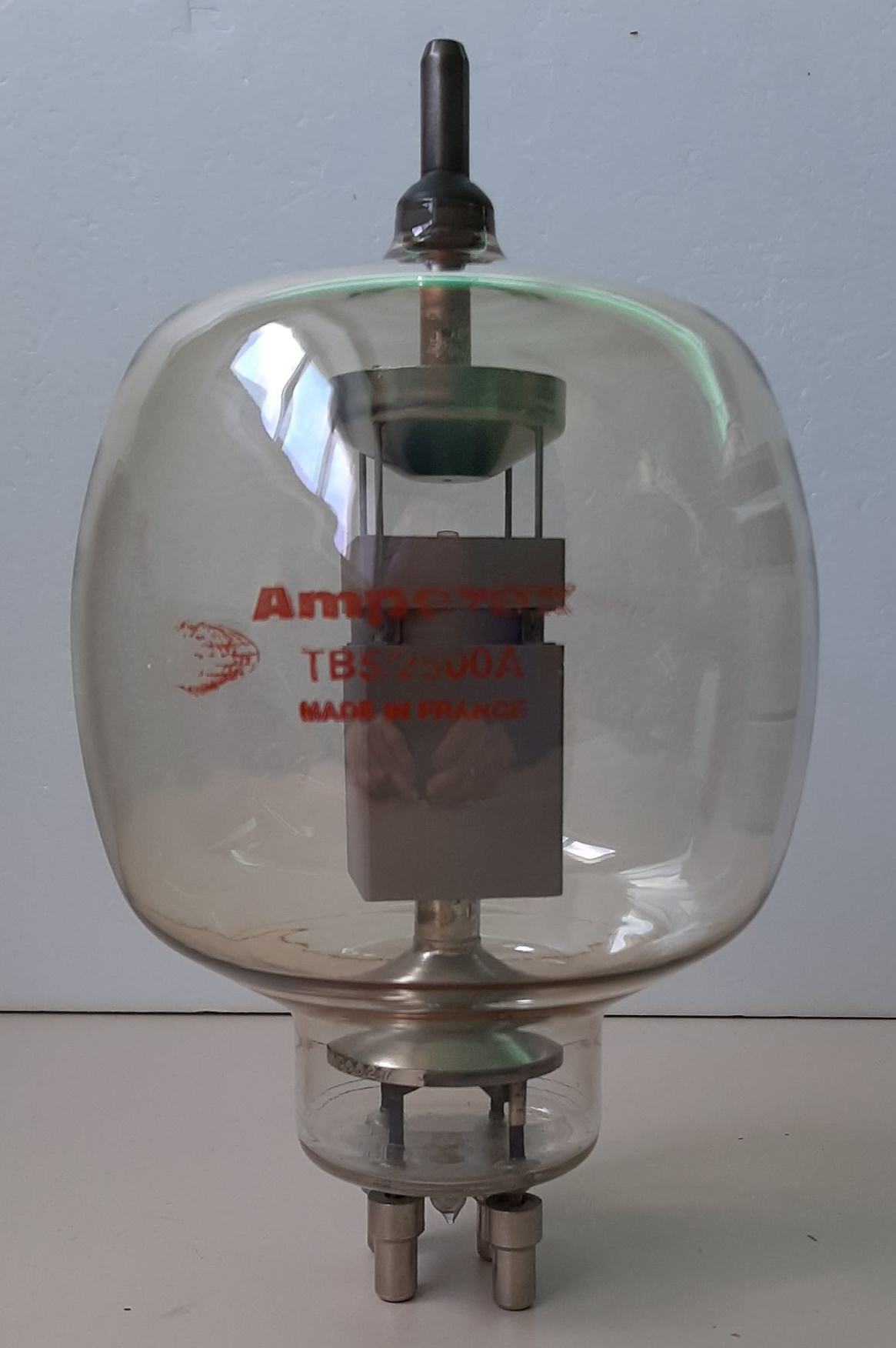 Die TB5/2500 ist vorgesehen für Industriegeneratoren. Sie ist die größte und leistungsfähigste Glas-Senderöhre, die mir bekannt ist. Sie ist nicht leicht zu bekommen, noch dazu wenn sie neu ist wie diese. Amperex ist eine amerikanische Firma, gegründet in den 1920er Jahren, die später von Philips übernommen wurde. Sie stellt eine Edelsparte in der Röhrenfertigung dar. Amperex-Röhren findet man in hochwertigen Messgeräten und HiFi-Anwendungen. |