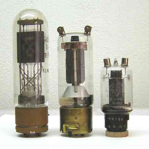 Senderöhren der deutschen Wehrmacht links: RS237, Triode Mitte: RL12P35, Pentode rechts: RL12P50, Pentode alle von Telefunken |